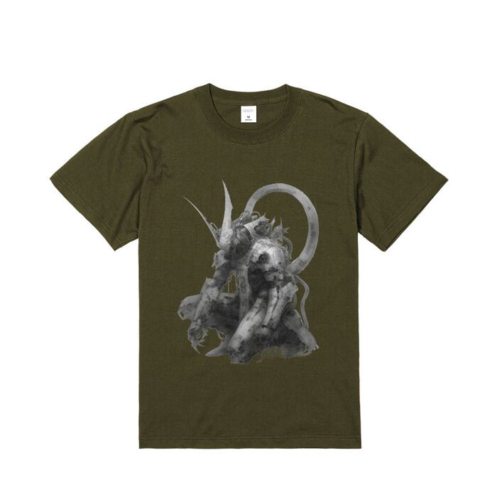 ショップの代表作。機械と精霊が融合したモノクローム・アートを、5.6ozのタフなボディに高精細プリント。日常服に“余白の美”を添える一枚。サイズ : S - XXL。